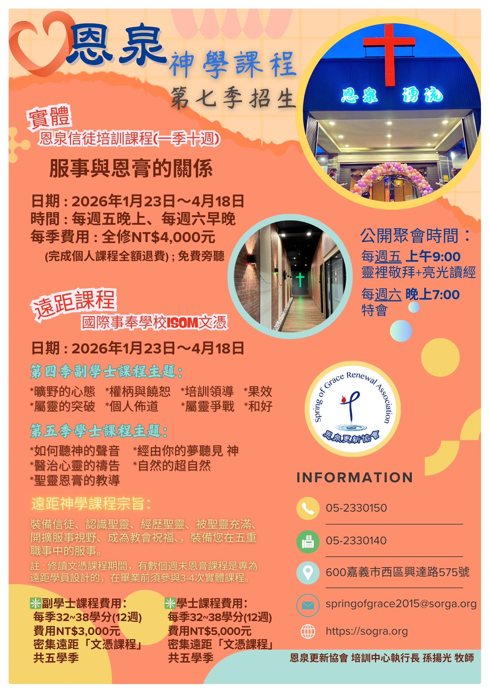 下一季課程開始報名囉~ 週五早上、週六晚上公開聚會,歡迎參加~